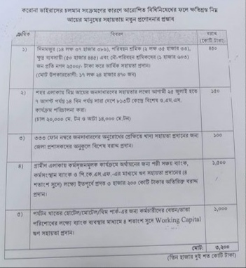 ১. দিনমজুর, পরিবহন শ্রমিক, ক্ষুদ্র ব্যবসায়ী এবং নৌপরিবহন শ্রমিকদের জন্য জনপ্রতি নগদ আড়াই হাজার টাকা করে আর্থিক সহায়তার জন্য ৪৫০ কোটি টাকা বরাদ্দ।