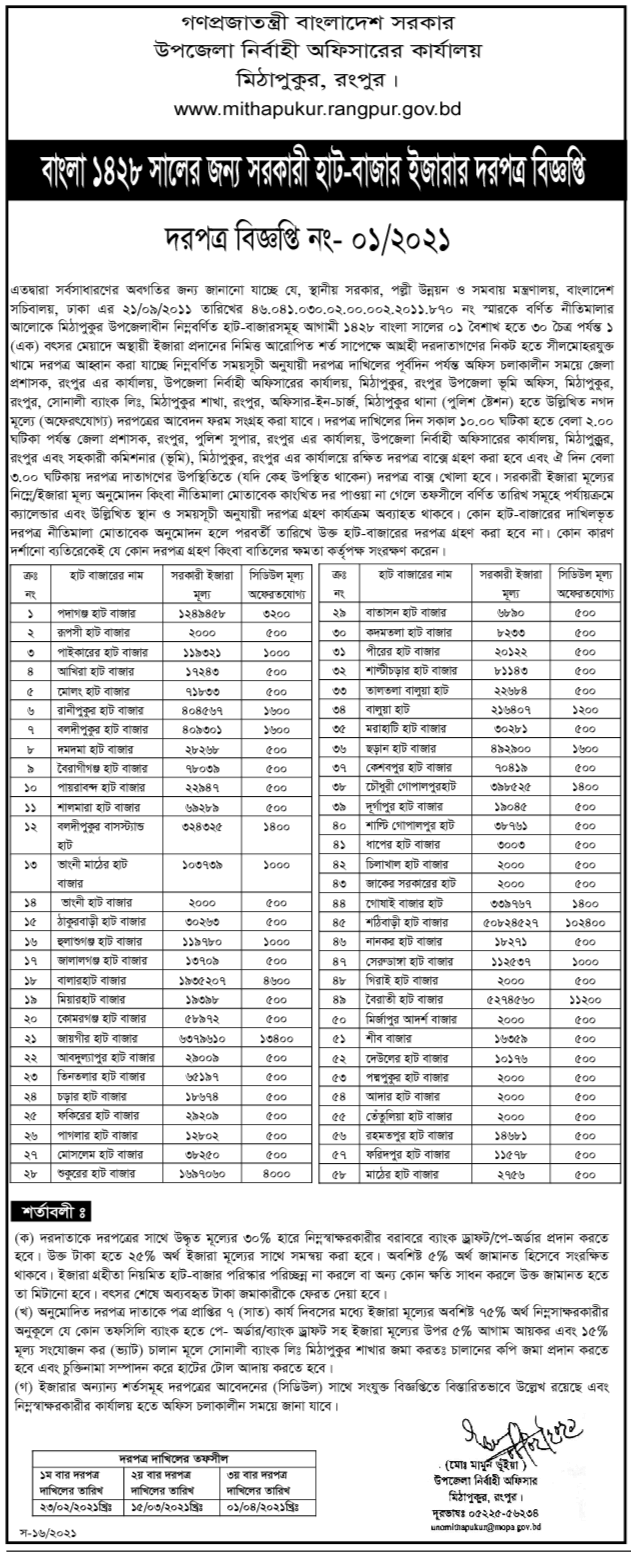 মিঠাপুকুরে ৫৮টি সরকারী হাট-বাজার ইজারা'র দরপত্র বিজ্ঞপ্তি[/caption]