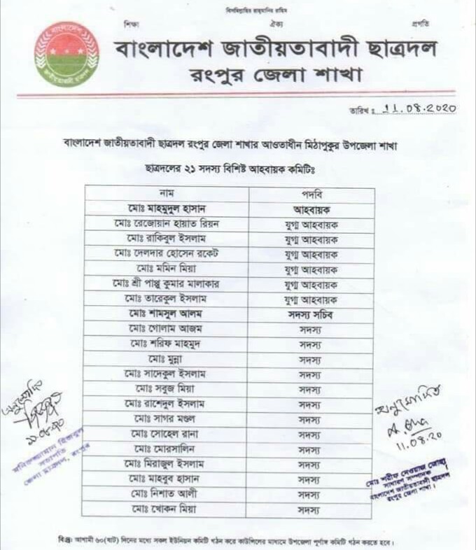 বাংলাদেশ জাতীয়তাবাদী ছাত্রদল মিঠাপুকুর উপজেলা শাখা ছাত্রদলের কমিটির অনুমোদন দিয়েছে রংপুর জেলা ছাত্রদল।