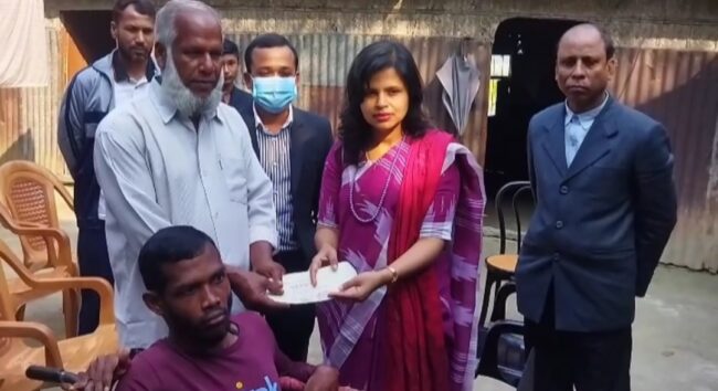 মিঠাপুকুরে আর্থিক সহযোগীতা হিসেবে উজ্জ্বলের বাবার হাতে পাঁচ হাজার টাকার একটি চেক প্রদান করেন ইউএনও ফাতেমাতুজ জোহরা।[/caption]