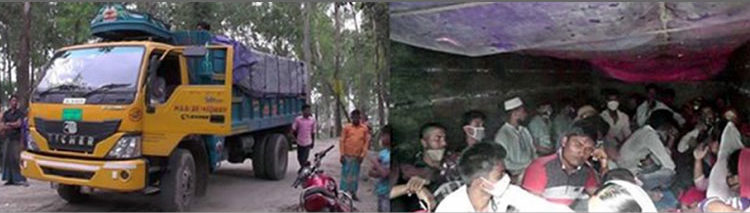 ট্রাকচালক সালাহ উদ্দিন মিয়া বলেন, ‘এমনি ট্রাকে করে মানুষ নিয়ে গেলে পুলিশ ট্রাক আটকাবে। তাই বাধ্য হয়ে সবাইকে বসিয়ে ট্রাকের ওপর এিপল দিয়ে ঢেকে দেওয়া হয়েছে। তারপরেও ঘাটে ঘাটে টাকা দিতে হবে।