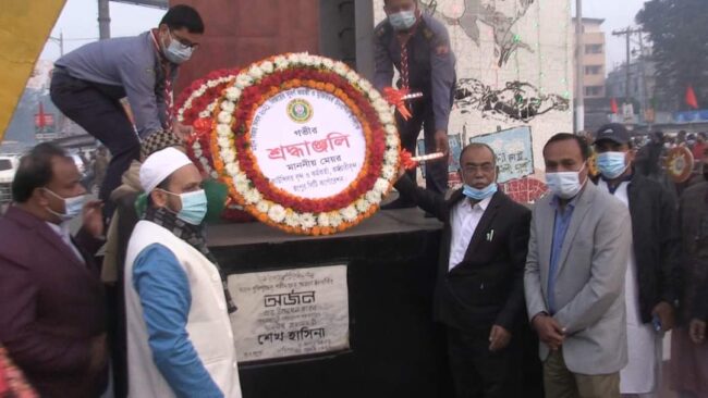রংপুরঃ মুজিব শতবর্ষ ও বিজয়ের সুবর্ণজয়ন্তীতে ডিসির মোড়ে বঙ্গবন্ধুর ম্যুরালে পুষ্পস্তবক অর্পন করেন রংপুর সিটি করর্পোরেশনের মেয়র মোস্তাফিজার রহমান মোস্তফা।[/caption]
